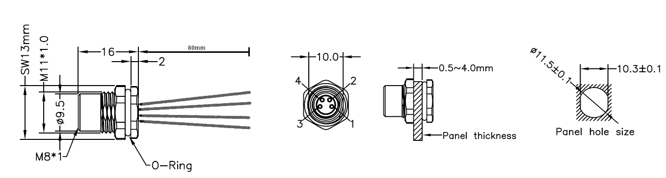 This is a 4-pin IP67 waterproof M8 female connector. It is compatible with code A. This connector should be assembled from the inside of a housing or a panel.
