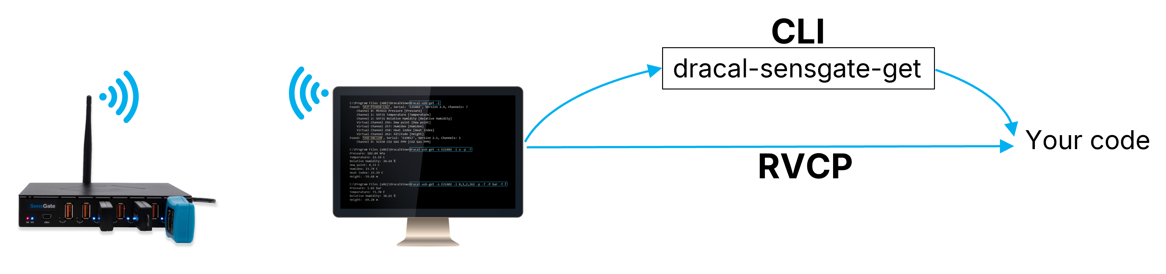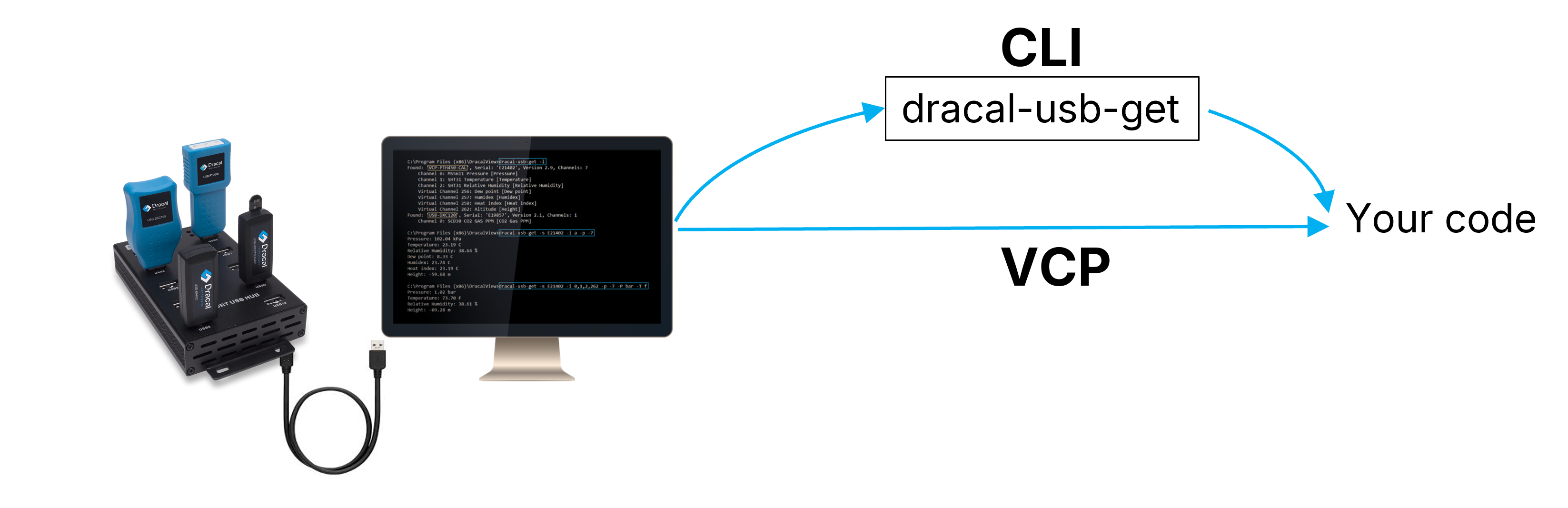 Local installation contrasts with installation using SensGate, which allows access to sensor data via Wi-Fi or Ethernet (see below for this type of installation). In this installation, your Dracal sensors are connected by USB directly or via a hub to a central computer that accesses the data. In this context, there are two integration methods available to you: using Dracal command line interface (CLI) tools or COM communication for sensors equipped with the VCP (Virtual COM Port) option.
