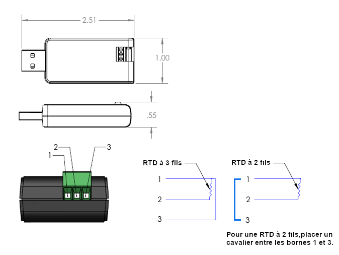 Adaptateur USB pour sonde RTD 2/3 fils avec bornier